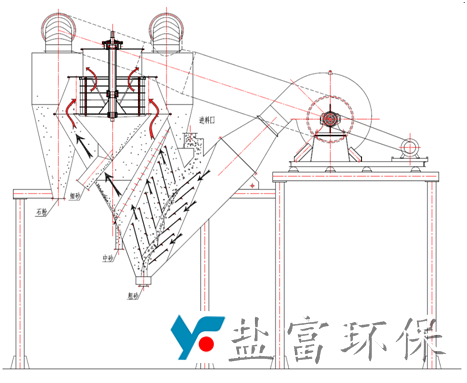 鹽富環(huán)保公司生產(chǎn)的YF-SF復(fù)合選粉機(jī)是將靜態(tài)的V型選粉機(jī)和內(nèi)循環(huán)高效渦流選粉機(jī)有機(jī)結(jié)合,可分級(jí)粒徑為4.75mm甚至最大粒徑達(dá)10mm以上的物料。來料首先通過靜態(tài)的V選進(jìn)行粗細(xì)分離,中砂和細(xì)砂隨上升的氣流進(jìn)入高效渦流選粉機(jī)進(jìn)行分級(jí),石粉則被旋風(fēng)筒收集。從老式的轉(zhuǎn)子選粉機(jī)只能對(duì)機(jī)制砂簡(jiǎn)單脫粉到實(shí)現(xiàn)粗、中、細(xì)砂的精確分級(jí)。