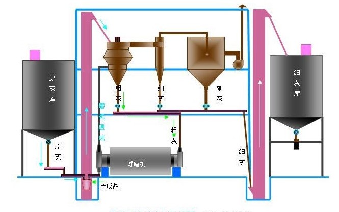 粉煤灰磨細(xì)、分選工藝說明:粉煤灰粉磨系統(tǒng)主要由原灰倉,葉輪給料器、電子計量稱、粉煤灰專用球磨機(jī)、選粉機(jī)、氣箱脈沖布袋除塵器、引風(fēng)機(jī)、螺旋輸送機(jī)、斗式提升機(jī)、給料機(jī)、控制系統(tǒng)等組成。系統(tǒng)直接由原灰倉下取灰,經(jīng)葉輪給料器給料,電子稱稱重后由螺旋輸送機(jī)輸送進(jìn)入磨尾提升機(jī),粉煤灰由提升機(jī)喂入選粉機(jī)進(jìn)行磨細(xì)前的分選,分選后的粗灰經(jīng)螺旋輸送機(jī)送入磨機(jī)進(jìn)料口,進(jìn)入球磨機(jī)研磨,經(jīng)磨機(jī)研磨后的物料中含有大量細(xì)灰,再次由提升機(jī)喂入選粉機(jī)分選,分選出的細(xì)灰經(jīng)后續(xù)螺旋輸送機(jī)送入成品灰?guī)欤C(jī)通風(fēng)除塵與選粉機(jī)細(xì)粉布袋除塵器共用;采用此種閉路研磨工藝與開路(無選粉機(jī))系統(tǒng)相比可提高臺時產(chǎn)量30~40%以上。